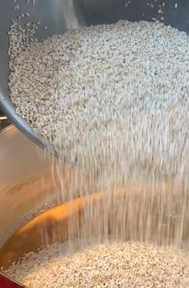 Transfer the amaranth to the bowl once has popped and become white, like baby popcorn. Repeat this process until all of the amaranth is popped.