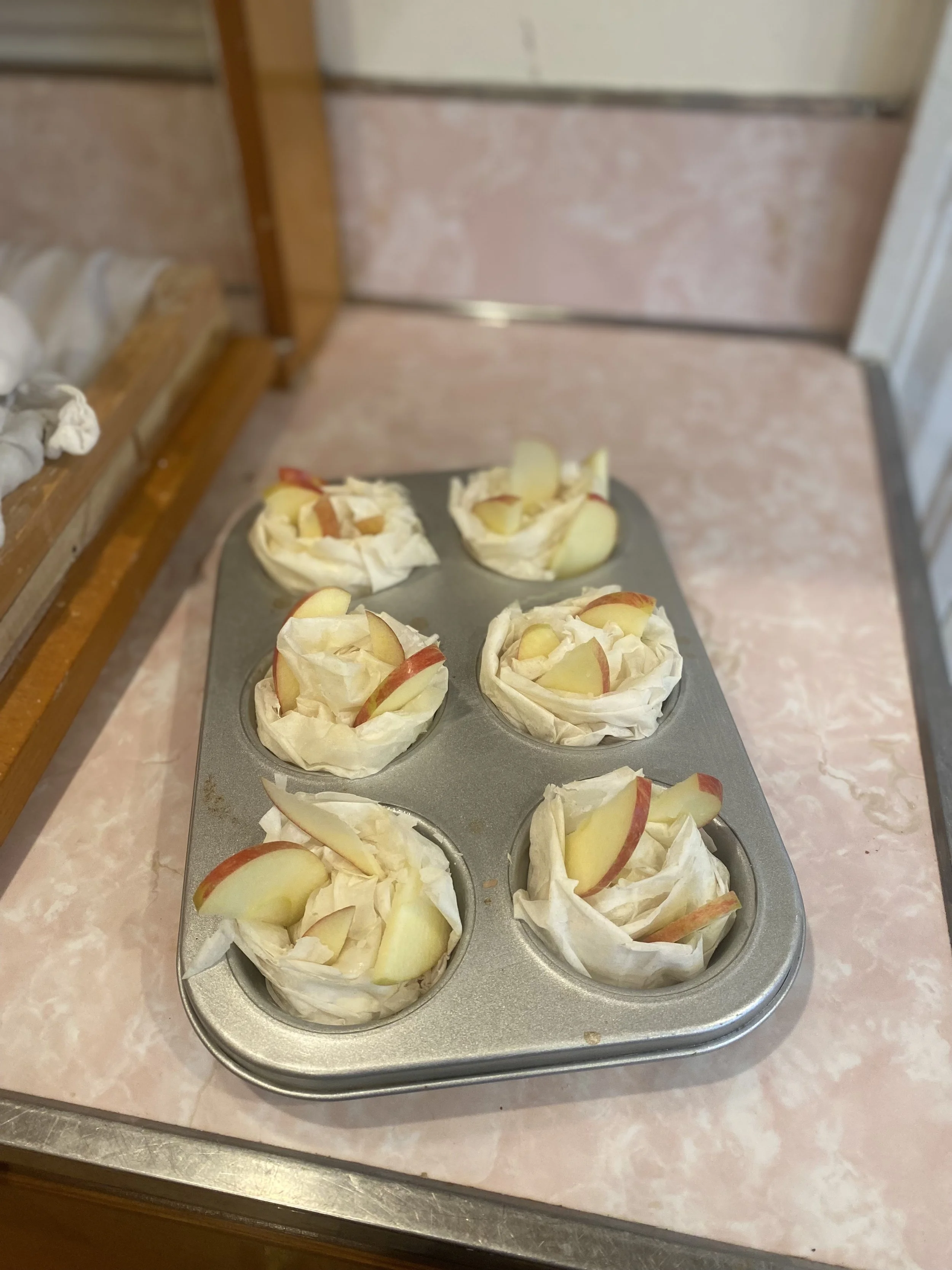 A box of phyllo includes more sheets than necessary for one pie, so I made individual servings in muffin tins and used up the remaining sheets. I’ll definitely be making more like this! I found a full sheet of phyllo to be pretty snug. It wasn’t easy to slide the apple slices in between the folds. Next time, I’ll use half a sheet for each.