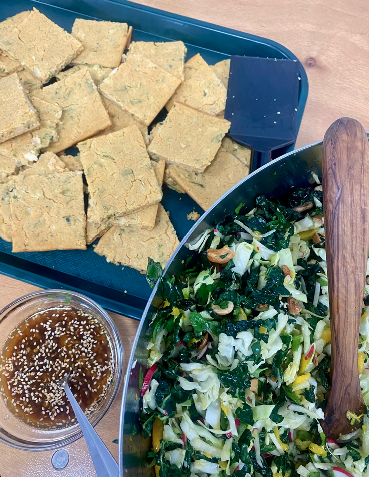 Here’s a version with cabbage, mango, black beans, cilantro, and shaved carrots. Instead of the sesame oil I used olive oil.