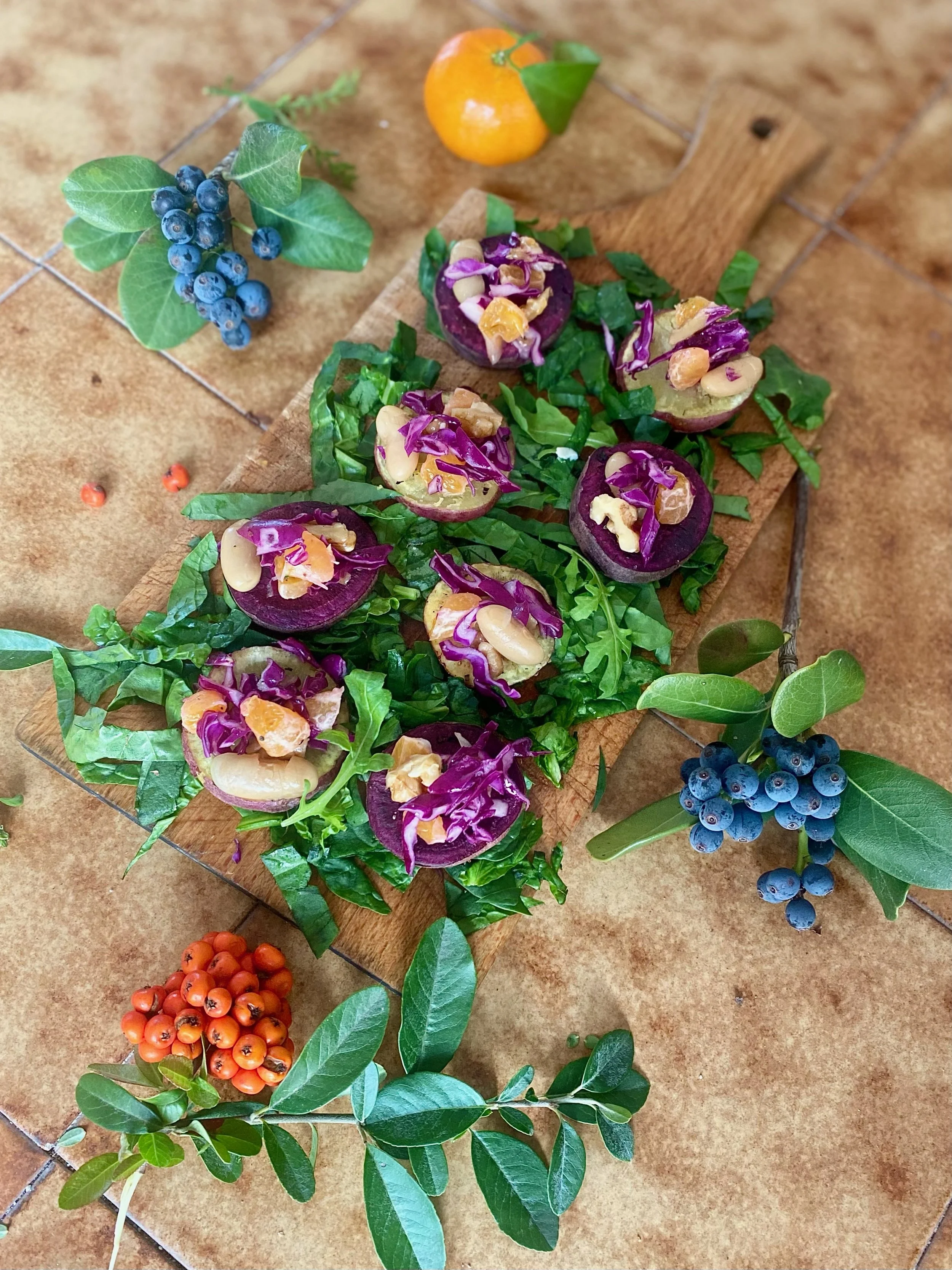 Another combination: Satsumas, shredded cabbage, white beans, walnuts on a bed of greens
